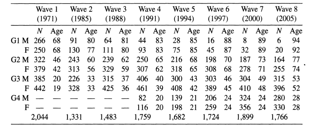 Таблица 1: Лонгитюдное исследование респондентов по поколениям и полу, волна 1 (1970) — волна 8 (2005).