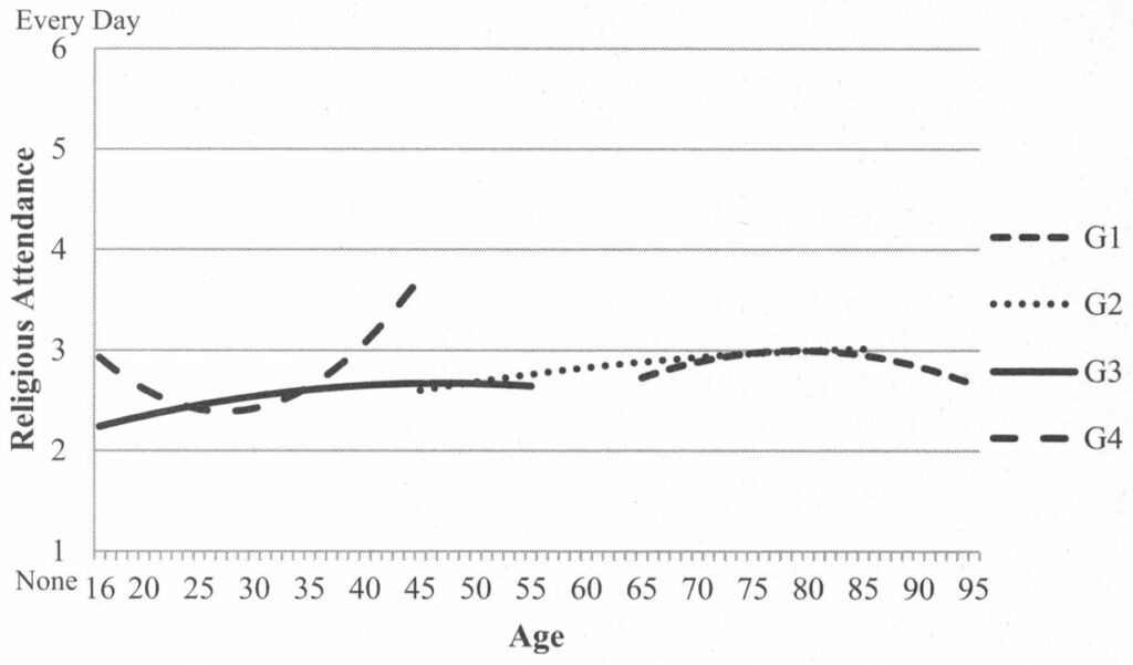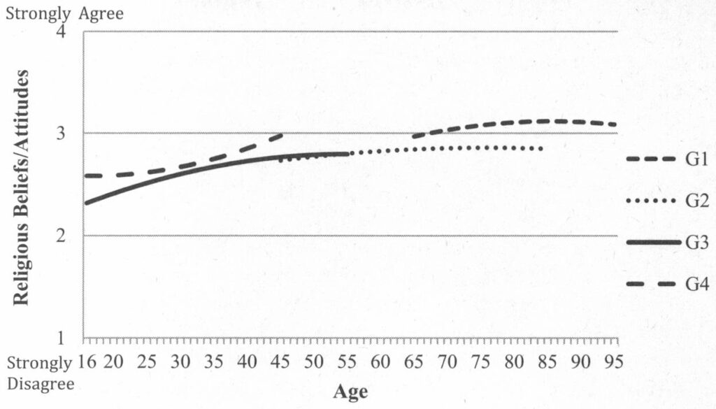 Более детальный анализ кривых на уровне отдельных поколений выявил более сложные возрастные тенденции. Представители G1, которым было около 60 лет на момент первого опроса в 1970 году, демонстрировали линейное усиление религиозной интенсивности. У них наблюдался первоначальный рост частоты посещения религиозных служб, за которым следовало снижение в поздней старости. Религиозные убеждения представителей G1 также усиливались на протяжении их 60-летнего возраста, а затем стабилизировались без последующего снижения. Для G2, которым на момент включения в исследование было около 40 лет, характерен линейный рост религиозной интенсивности и посещаемости богослужений; данные также показывают значительное, хотя и умеренное, ускорение укрепления религиозных убеждений по мере их перехода к семидесятилетнему возрасту. Представители G3 имели средний возраст 19 лет при первом опросе в 1970 году. У них наблюдался рост по всем трем показателям по мере достижения середины третьего десятилетия жизни, однако рост посещаемости и религиозных убеждений заметно замедлялся после перехода к пятидесятилетнему возрасту и в настоящее время демонстрирует некоторую степень снижения. Для представителей G4, которые начали включаться в исследование в 1991 году, мы наблюдаем первоначальное снижение религиозной интенсивности при вхождении в раннюю взрослость, за которым следует достаточно быстрое положительное ускорение к середине 30-летнего возраста. В отношении посещаемости религиозных служб наблюдается еще более резкое снижение в возрасте 20 лет, за которым следует еще более сильный рост в 30-летнем возрасте, тогда как по религиозным убеждениям фиксируется восходящий поворот, начинающийся примерно с 30 лет. Быстрый рост уровней религиозности у представителей G4 может соответствовать стадии семейного цикла, когда религиозная социализация детей приобретает особую значимость; для того чтобы определить, сохранится ли этот тренд, стабилизируется или снизится, необходимы будущие лонгитюдные данные.